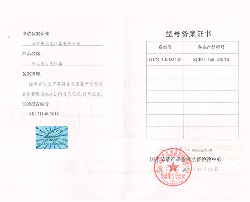干式電力變壓器型號備案證書